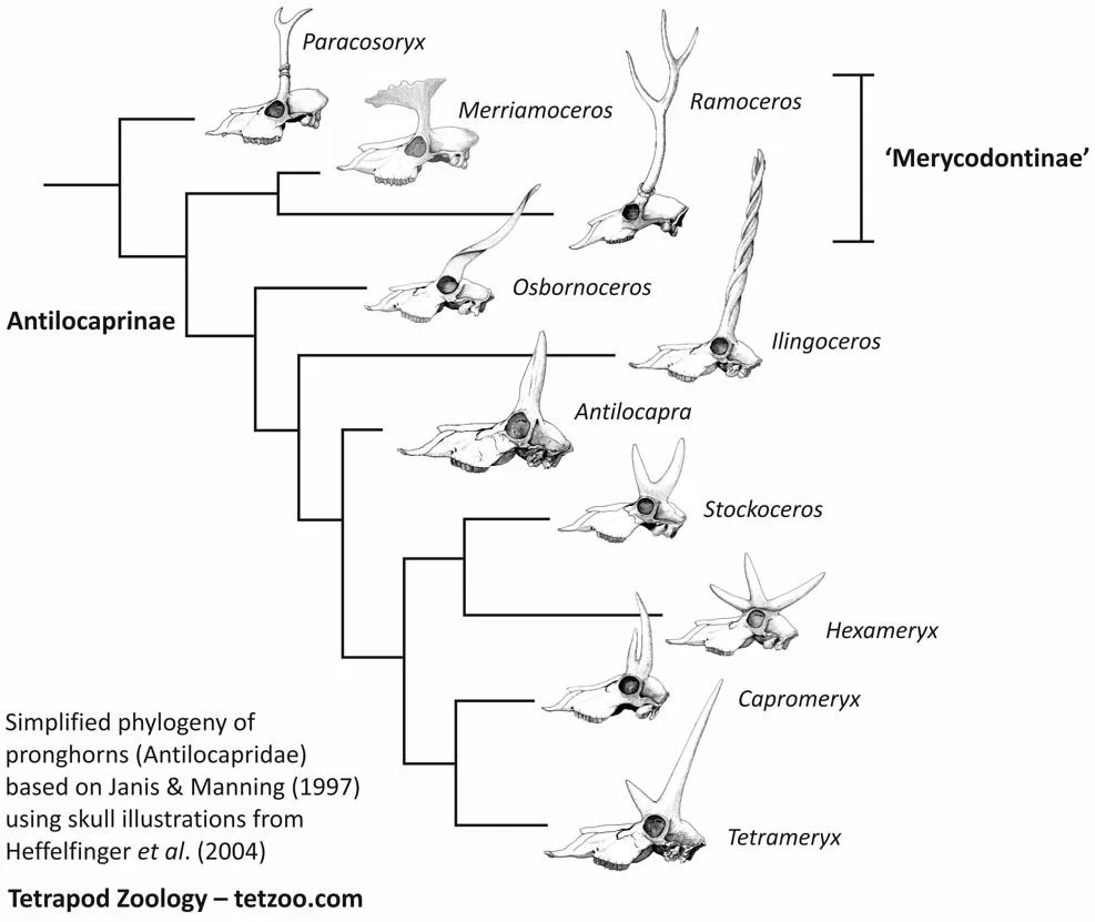 Key anatomical features defining the pronghorn clade include large eyes positioned far back on the skull, an enlargement of the auditory bulla relative to their ancestors, which likely enhanced their hearing capabilities, and the absence of digits 1, 2, and 5 on their limbs. This digit loss means pronghorns do not have dew claws, distinguishing their limb structure from many other ungulates.